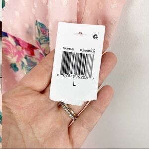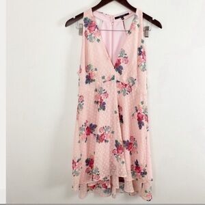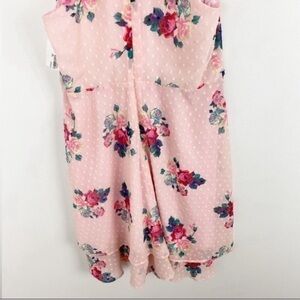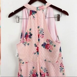 Brand new. Light pink floral. V-neck. Fit & flare. Tired. Textured polka dot. Chiffon. Racerback. Back zipper. Sleeveless. Special occasion. Wedding guest. Spring baby shower or bridal shower dress. Mini length. Lightweight.