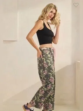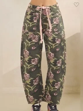 Relaxed wide-leg barrel jeans in an olive base with pink rose print. Soft, comfortable fabric with an adjustable pink drawstring waist. Side pockets for everyday convenience. Stylish lounge-to-street silhouette that pairs well with fitted tops.