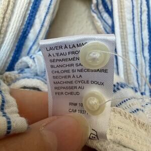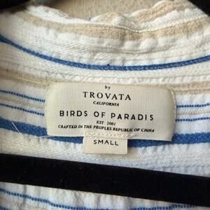 Birds of Paradis by Travota striped tunic top featuring a relaxed silhouette with a curved high-low hem, classic collar, and button-front closure. Soft textured cotton-blend fabric with subtle puckering gives this piece an easy, coastal feel. Size small - 19" pit to pit; 33" length in front, 40" length in back.