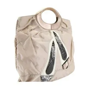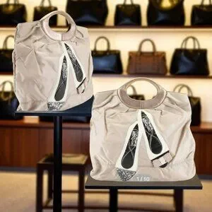 Salvatore Ferragamo nylon tote bags and sequined flats, as the exact models are likely a store display or limited edition: