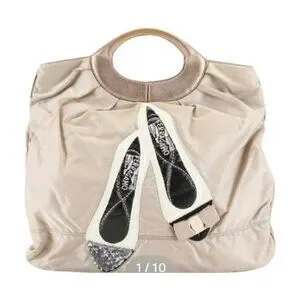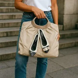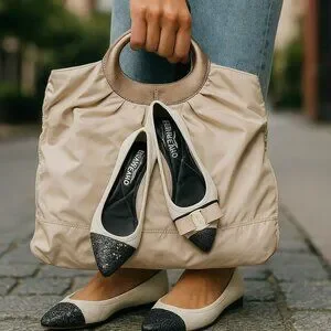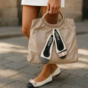 Material: The bag is primarily beige nylon with what appears to be leather trim on the handles and base. The flats feature the same beige material and a contrasting dark (likely black) design on the vamp and toe.
