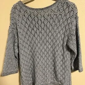 Openwork knit pullover by Chico's. Light blue and navy two-tone pattern. Crew neckline with relaxed silhouette. Breathable textured fabric. Easy layering sweater.