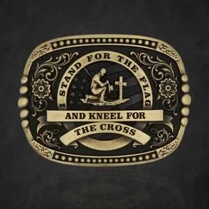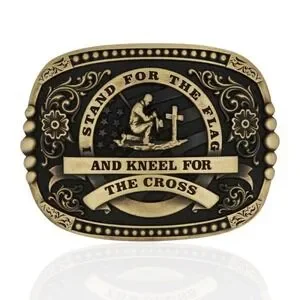 Show your pride for your country and faith with this buckle. The square buckle features a cowboy kneeling at a cross in the center of the buckle, behind him is the USA flag. The words "Stand for the Flag and Kneel for the Cross" are boldly displayed around the center figure. Gold tone filigree and flowers cover the background on the left and right of the center figure and an intricate edge completes the design. This cast buckle has a standard 1.5 inch belt swivel.