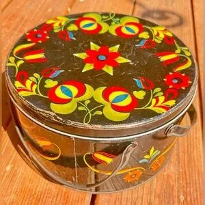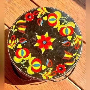 Round metal tin with vibrant floral folk art on a black background. Bright red, yellow and blue flower motifs. Great as decorative storage or display.