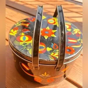 Vintage Pennsylvania Dutch Folk Art Metal Picnic/Sewing Tin Lidded w/Handles
