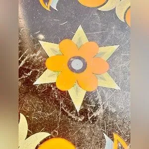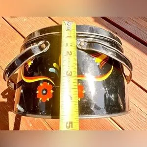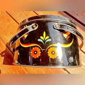 Black enamel with painted red, yellow, and orange flowers.