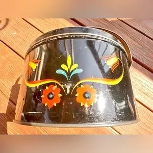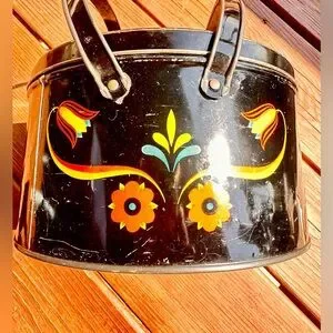 Preloved vintage Pennsylvania Dutch folk art metal picnic basket or sewing tin featuring a black toleware finish with a colorful floral design.