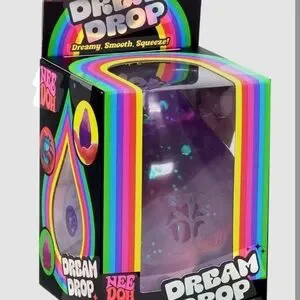 Dream Drop Nee Doh stress ball in purple with glitter flecks. Squeeze toy in fun, glossy packaging. Bright rainbow-accented box shown.