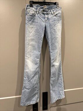The Silver Jeans Co. Tuesday Women's Size W29 Blue Low Rise Denim Jeans Capri 28x33 is a stylish and comfortable pair of jeans perfect for any casual or trendy outfit. Made from cotton denim with a medium wash, these solid blue jeans feature a low rise waist and a button closure. The capri length and embroidered accents add a modern touch to the classic American design. With a comfortable fit and a blend of vintage and contemporary styles, these Silver Jeans are a versatile choice for any woman's wardrobe.