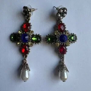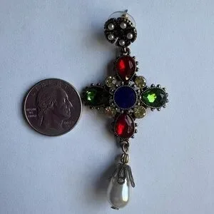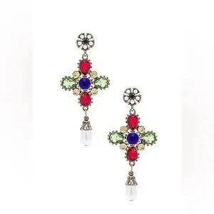 Gloria Earrings in Multi by SHASHI. Elegant multicolor cross drop earrings with vibrant red, blue, green, and gold crystals.