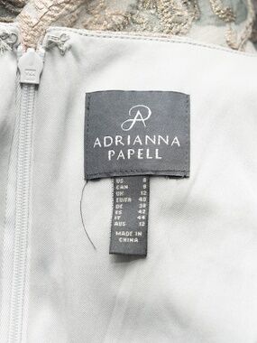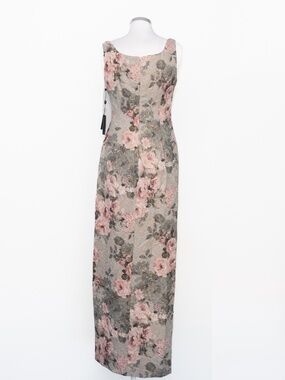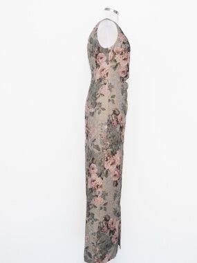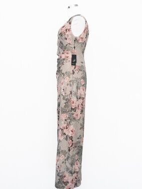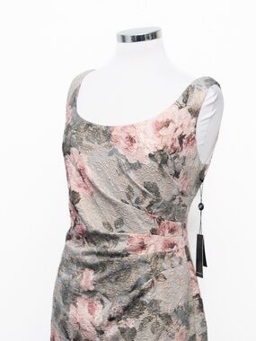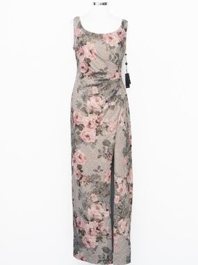 This Adrianna Papell column gown features a softly structured silhouette with a romantic metallic floral jacquard that catches the light in a subtle, refined way. Designed with a classic scoop neckline and wide straps, it offers balanced coverage while maintaining a clean, elongated shape through the body. Gentle ruching at the waist adds dimension and a flattering drape, while the front slit brings ease of movement and just a hint of edge. The fabric has a textured, slightly raised weave with gold metallic threading woven through blush and slate-toned florals, giving it depth without feeling overly flashy. Finished with a concealed back zipper for a smooth fit. A polished option for formal weddings, evening events, or black-tie occasions.
