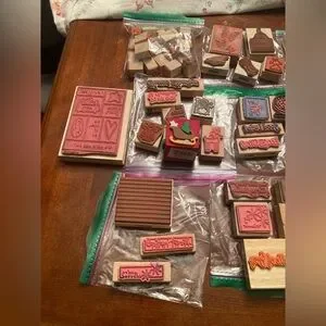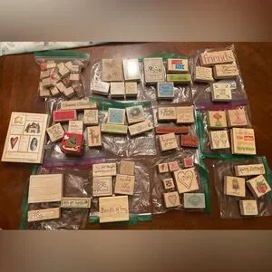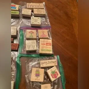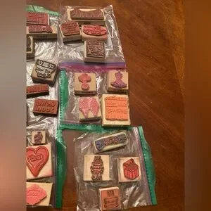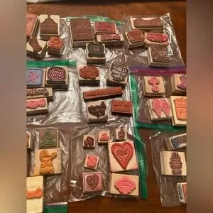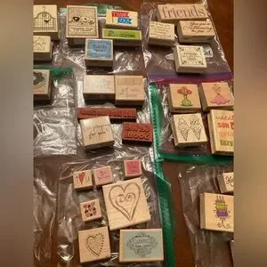 A collection of assorted rubber stamps with various designs and messages. Perfect for crafting and scrapbooking. Over 75 stamps including a complete set of alphabet stamps. Mix of used and unused stamps, look at photos for more details.
