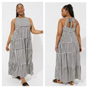 Flowy tiered maxi dress with a halter neckline. Sleeveless design with a tie-back detail. Lightweight and breezy for warm days. Classic gingham pattern for timeless style.