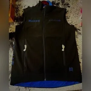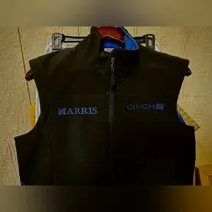 Very nice Brand new with tags Black Cinch soft shell vest with Blue Harris Saddlery embroidered on it. Vest is size XS; measurements Length of front 26”, hip 21”, waist 21” and back length 31 1/2”