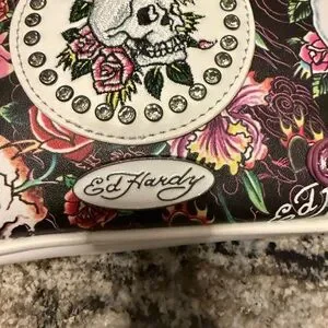 Ed Hardy Pink Floral Skull Accent Baguette Bag with crossbody