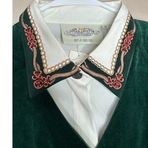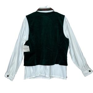 Holiday enchantment unfolds in this vintage Susan Bristol vest and top set. A rich, dark green velvet vest offers an exquisitely soft touch, further enhanced by embroidered details of festive ribbons and wheat that adorn the two front pockets. The button-down top adds contrast with its crisp white hue, accented by intricate embroidery around the collar that echoes the embellishments on the vest. Together, these elements evoke cozy nights by the fireplace and the charm of festive celebrations. Ideal for holiday gatherings, vintage-themed events, or adding a touch of elegance to a casual day out.