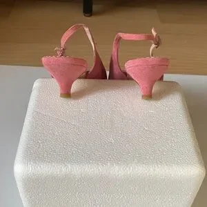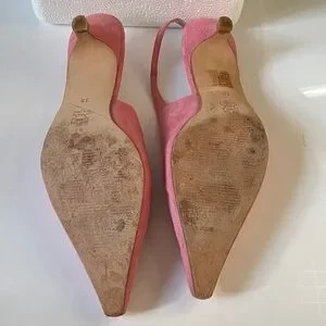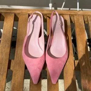 Elegant pink suede slingback flats with a pointed toe. Soft pink upper provides a polished, feminine look. Slingback strap offers a secure, comfortable fit. Versatile design for day-to-night wear.