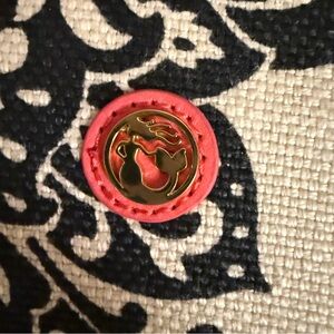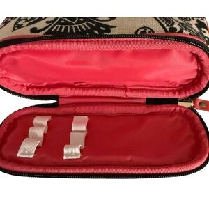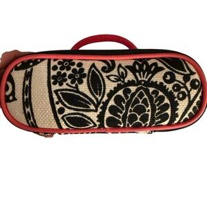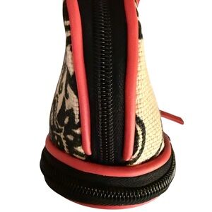 Darling bag! Ivory and black graphic floral printed linen accented by hot pink. The inside is vinyl lined for easy cleaning. Bottom zip compartment can hold makeup brushes.