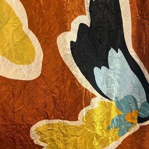 Sleeveless dress with bold colorblock pattern. Rust, black, yellow and aqua panels. Smooth, crushed satin fabric with gentle drape. Versatile statement piece for daytime or evening wear. Worn once.