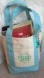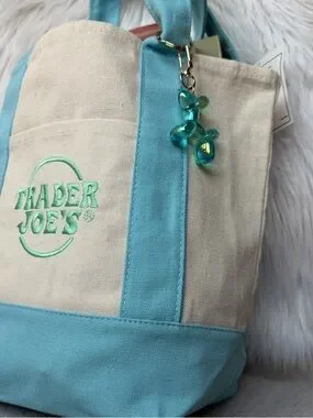 Mini Canvas tote bag with blue straps and trim. Embroidered Trader Joe's logo on front. Includes iridescent aqua balloon-dog key charm. Casual, beachy look. Great for everyday use.