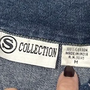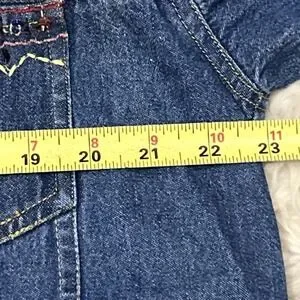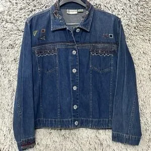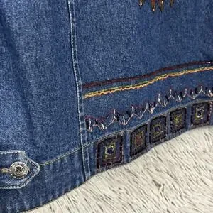 This vintage 90's artsy bohemian whimsy mythical beaded Aztec denim jacket in medium size is a unique and statement-making piece for women. Made from cotton denim with a short length and long sleeves, it features a colorful Aztec-themed design with beaded accents, perfect for those who love a bohemian style. The jacket has a button closure, a collared neckline, and is suitable for all seasons, making it a versatile and eye-catching addition to any wardrobe.