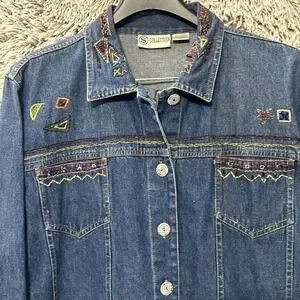 Vintage 90's Artsy Bohohemian Whimsy Celestial Beaded Aztec Denim Jacket Medium