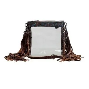 Transparent PVC body for easy visibility. Brown leather trim and long fringe accents. Adjustable leather strap for versatile wear. Secure top zipper closure.