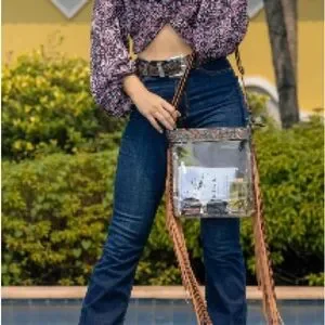 New Stadium Concert Bag Clear Adjustable Crossbody with Brown Leather Fringe