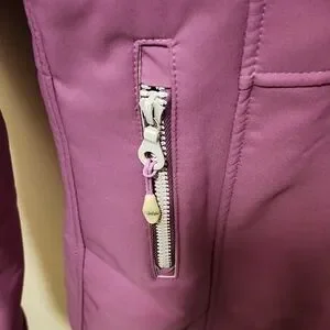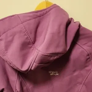 Chlorophyll purple hooded softshell coat with front zip and fleece lining. Water-resistant shell with secure zip pockets and adjustable hood. Comfortable, warm, and stylish for everyday wear.