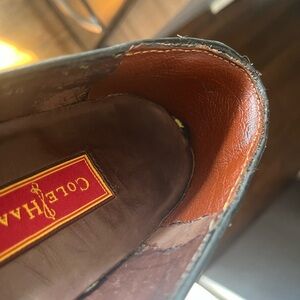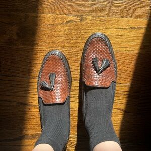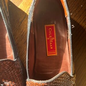Classic Cole Haan loafers with woven leather uppers. Tassel accents on vamp. Sleek black trim and comfortable low heel. Versatile style for work or casual wear.