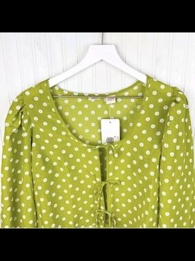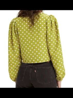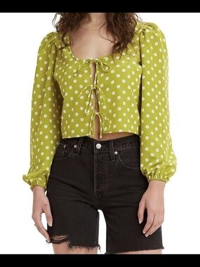 Cropped blouse with all-over white daisy print. Scoop neckline and three front ties. Long puff sleeves with elastic cuffs. Lightweight, breezy fabric for easy wear.