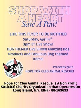 Live Show on Saturday, April 4th at 3pm ET where all proceeds will go to the Hope for Cleo Animal Rescue. We will have amazing dog products as well as fabulous dog theme items for you!