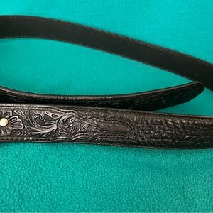 “Yoke” is tooled. Body of belt appears to be an exotic leather.