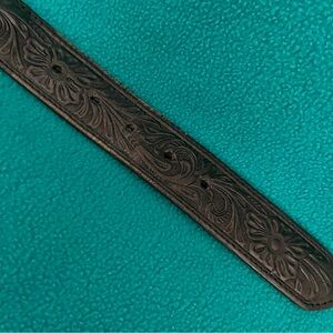 Western-inspired tooled leather belt from Nocona. Detailed floral tooling along the strap. Polished engraved silver-tone buckle adds contrast. Sturdy construction for everyday wear. Timeless black styling pairs with many looks.