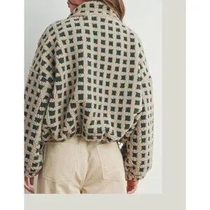 Women green Cropped Sherpa Fleece Plaid Jacket Chunky Outerwear