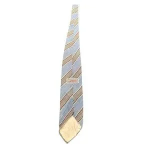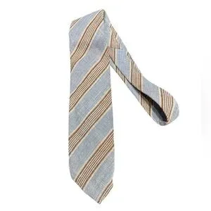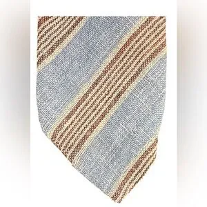 Woven striped tie. Features alternating light blue, cream, and brown stripes. Textured fabric with classic diagonal pattern. Versatile accessory for smart casual looks.