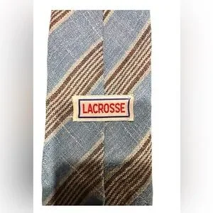 Vintage Lacrosse Woven Striped Tie Blue Brown Beige 3.5” Wide 56” Length Retro