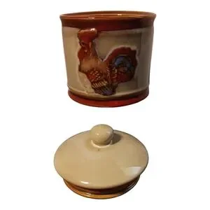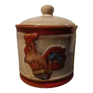 Charming approximately 5" H ceramic cannister featuring a colorful rooster design. Perfect for kitchen decor. New without original box.