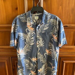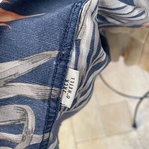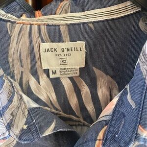 Casual short-sleeve button-down by O'Neill. Navy base with peach floral accents and light gray tropical leaves. Single chest pocket. Lightweight, breezy style for warm days.