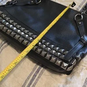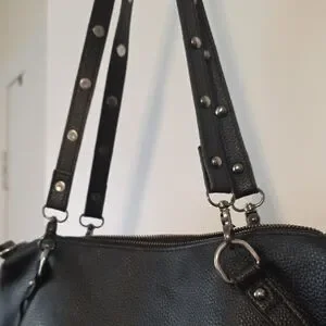 Stylish black shoulder bag with metallic stud detailing. Comes with two additional straps, one for crossbody and a shorter one. Lots of organization pockets inside. Designed for everyday use with a bold, modern look. Versatile black color complements many outfits.