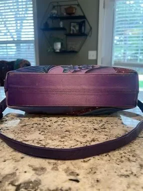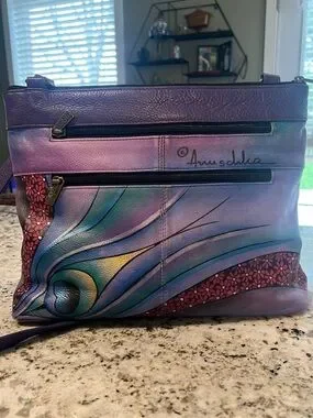 Hand-painted leather adjustable crossbody by Anuschka with vibrant peacock and floral accents. Secure zip closure on top, magnetic front pocket, 2 rear zippered pockets.