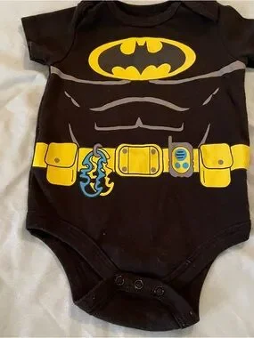 Official Batman one-piece with bold yellow logo and printed utility belt on black fabric. Small blue charm detail on the belt. Snap closures at the crotch for quick changes. Soft, comfortable material for play or everyday wear.