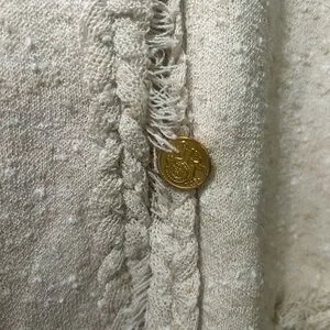 It's crafted from soft-yet-textured yarn that has a marled look and trimmed around the edges with fluffy fringe. Gold coin buttons and braided accents take things up another notch.