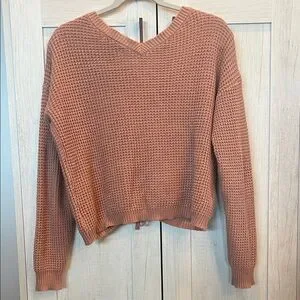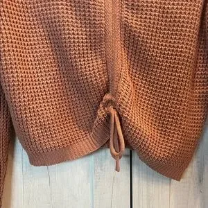 Chic V-neck sweater with a cozy knit. Features a stylish drawstring detail. Ideal for layering.