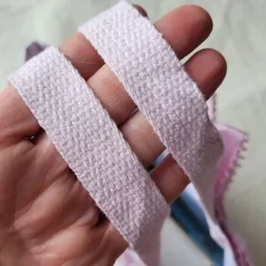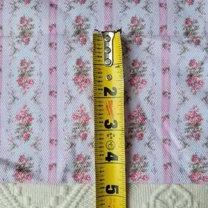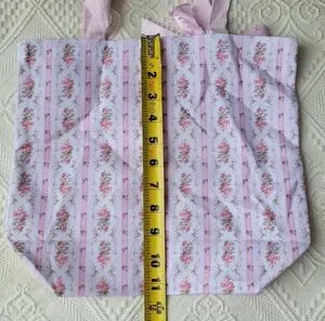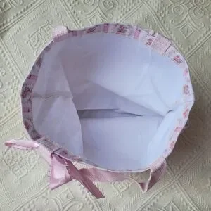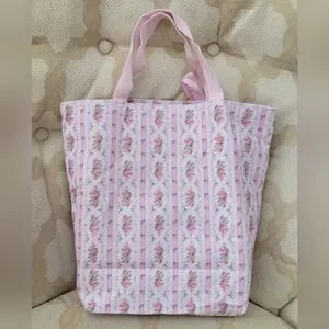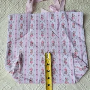 White fabric with pink floral and stripe pattern. Pink handles. Pink bow.