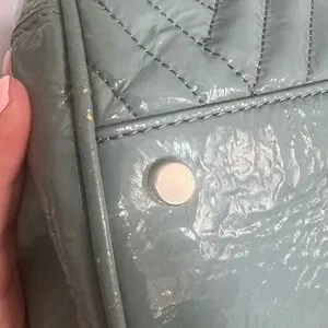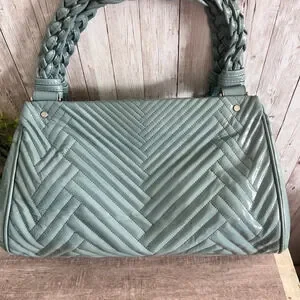 Great condition. Only flaws are a few areas on the corners where the color has chipped and photos are attached. Nothing major or noticeable by other people when using. I love the quilted chevron pattern with the braided handles on this bag to make it a statement piece. The color is a grey/blue. There are three zippered sections.