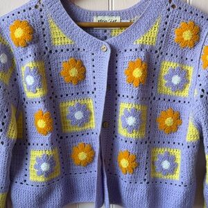Soft lavender crochet cardigan with bright yellow and orange floral squares. Lightweight, feminine design with button-front closure. Perfect for layering over dresses or tees for a cheerful, vintage-inspired look.