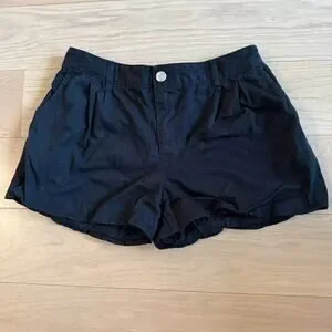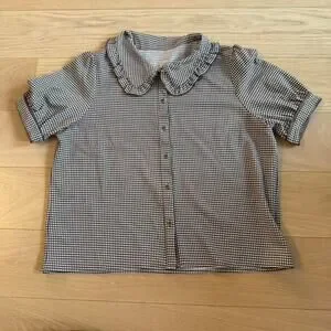 Soft feminine silhouette with a fitted tie-front gingham blouse featuring a rounded collar and subtle puff sleeves. Paired with low-rise black mini shorts with a slightly flared hem. Perfect for coquette / casual / model-off-duty styling.