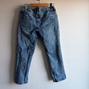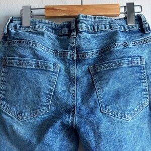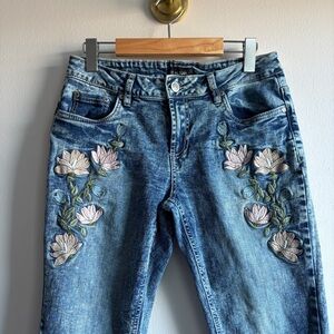 Light blue jeans with pink floral embroidery on the front thighs. Relaxed for comfortable everyday wear. Soft faded blue wash pairs easily with tees and blouses. Subtle embroidered pink flowers add a feminine touch to casual denim. Slight stretching on the bottom edges.