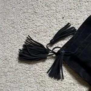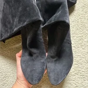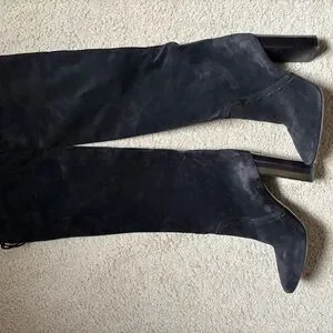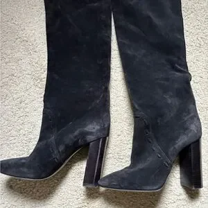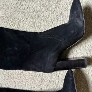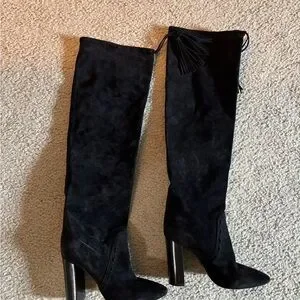 Sleek black suede knee-high boots with a sturdy block heel. Soft suede upper offers a refined look. Tassel accents add subtle, fashionable detail.